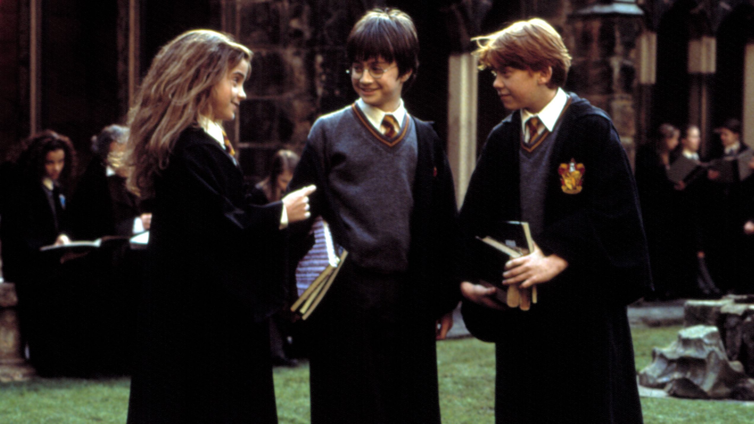 主人公のハリーが「ホグワーツ魔法魔術学校」に入学し、ロンやハーマイオニーといった仲間たちと共に、悪い魔法使いヴォルデモートに立ち向かう物語です。